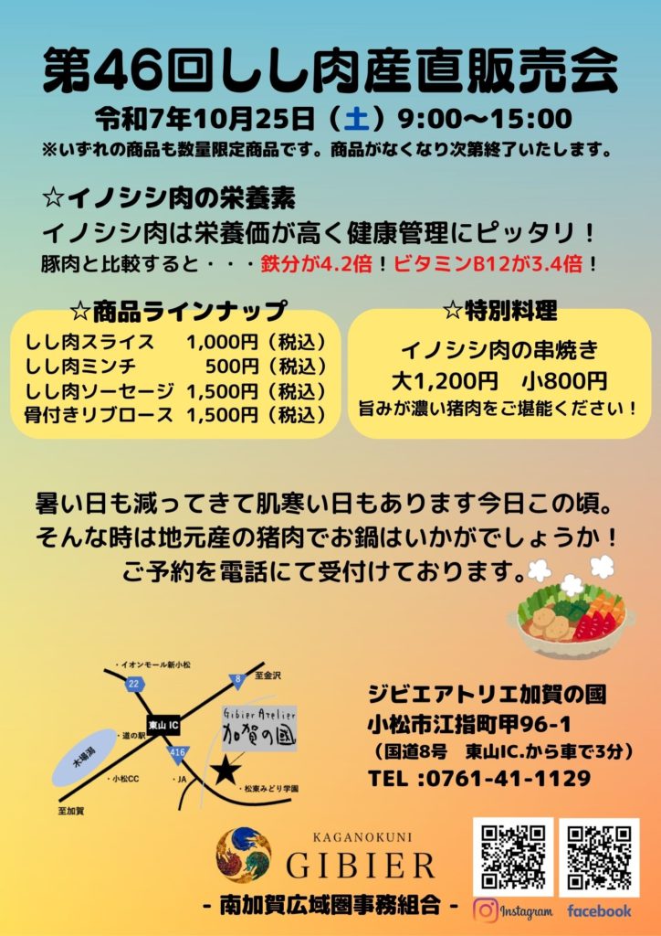 イベントPosted > 2025.10.20 【10月25日(土)開催第46回産直販売会】 毎月恒例の産直販売会を開催いたします。目玉はイノシシ肉の串焼き!!!炭火で焼き上げた串焼きは絶品です!開催時間は9時から15時までとなっております。皆様のお越しを心からお待ちしております。